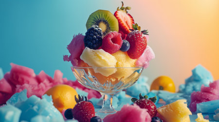 Delicious and colorful ice cream sundae topped with berries, sprinkles, and cotton candy, set against a bright blue background, evoking joy and indulgence.