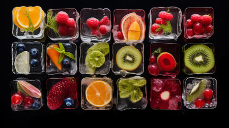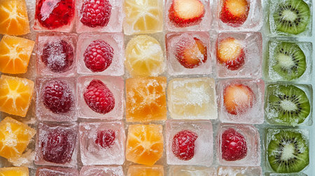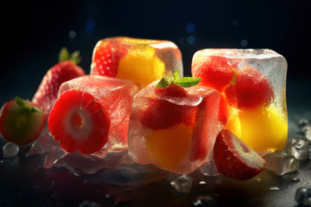 Fresh fruits frozen in ice cubes. Fresh healthy summer food. AI generative.