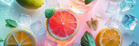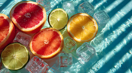 Colorful citrus fruits like grapefruit, orange, lemon, and lime are placed with ice cubes on a shiny surface, evoking a refreshing summer atmosphere