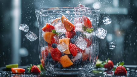 A vibrant mix of fresh fruits and ice creates a refreshing splash, perfect for a healthy smoothie. Explore colorful ingredients for nutritious recipes.