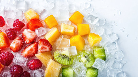 Fresh fruits and ice cubes arranged beautifully in a vibrant display during summer for a refreshing treat