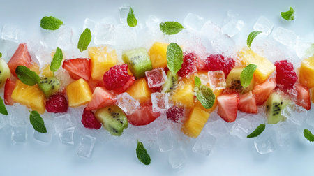A vibrant medley of fresh fruits including strawberries, pineapple, kiwi, and raspberries, artfully arranged on ice with mint leaves for a refreshing touch. Perfect for summer!