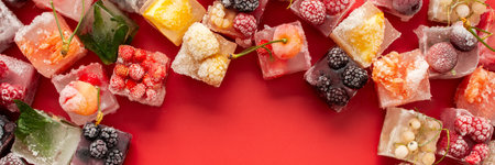 Frame of ice cubes with frozen berries and fruits and mint on red background, banner