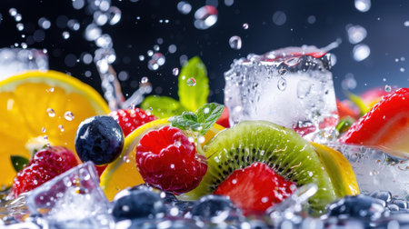 A vivid display of fresh fruits including strawberries, raspberries, kiwi, and lemon splashing in water. This colorful arrangement showcases ice cubes and droplets, perfect for promoting culinary creativity or summer beverages.