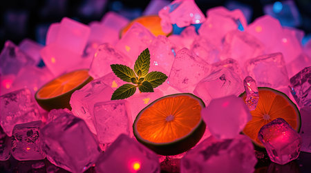 Vibrant fruit-flavored ice cubes filled with slices of citrus fruits create a refreshing visual. These eye-catching cubes rest on crushed ice, enhancing the summer vibe of the gathering.