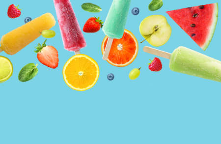 Strawberry, orange, raspberry, lime, lemon and blueberry fruit ice, refreshing fruity icecream on blue background, AI Generated illustration