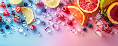 A playful backdrop with slices of various berries, citrus fruits, and ice cubes scattered on a gradient background transitioning from blue to pink. The vibrant and colorful arrangement adds a lively feel.