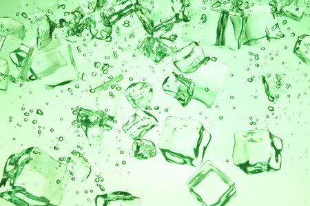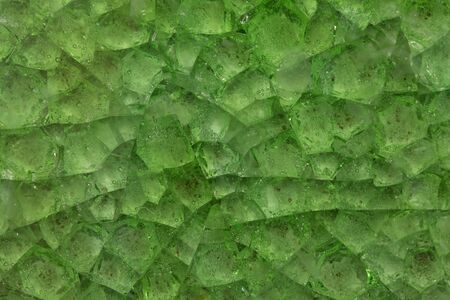 Concept of cold and refreshing. Ice cubes with water drops on a green background.