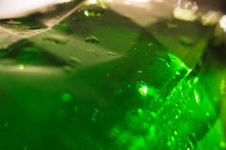 extreme closeup macro shot of green aerated water in a glass with ice cubes and lot of sparkles air bubbles. blurred abstract summer background