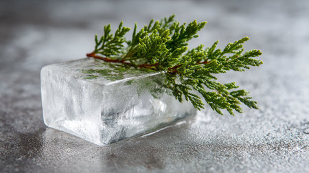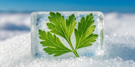 Herbs preserved within crystal-clear ice glisten under the gentle winter sun on snowy ground.
