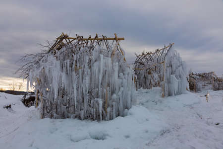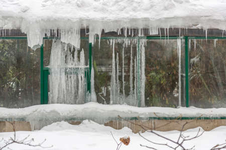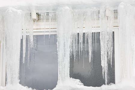 Icicle windows on winter time. Freeze temperatures backgrounds. Horizontal