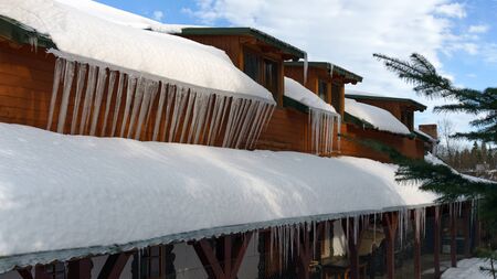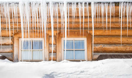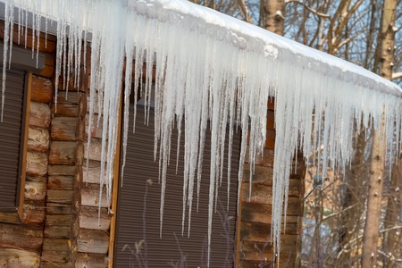 Large icicles on the roof of the wooden house. The problem is in the thermal insulation of the building