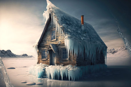 A wooden cabin covered in snow with icicles hanging from the eaves. The scene is set in a snowy forest with mountains in the background. The sunlight shines through the icicles, creating a stunning effect.