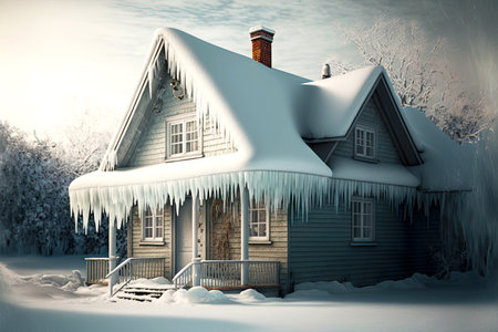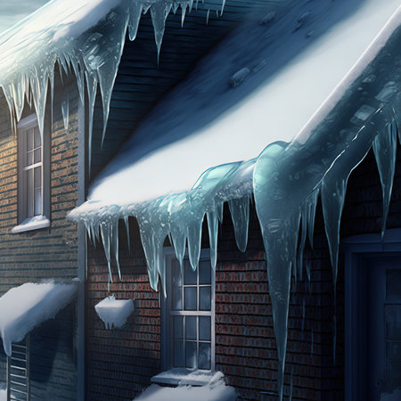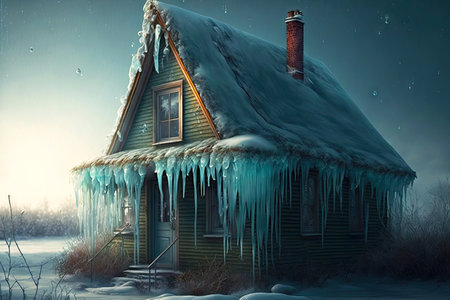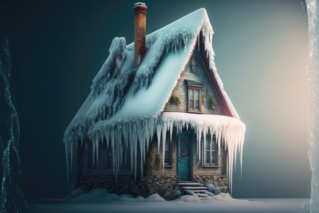 Big icicles hanging on the side of the roof, house with icicles, melting ice, heat escaping through the roof, bad insulation in winter illustration