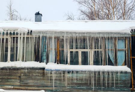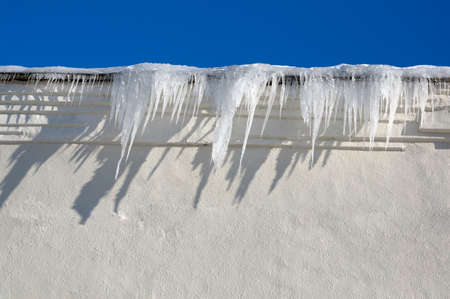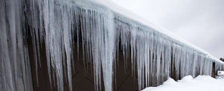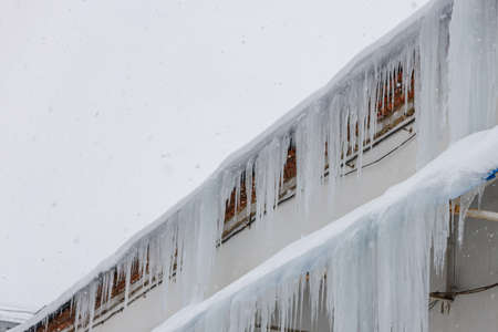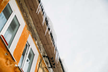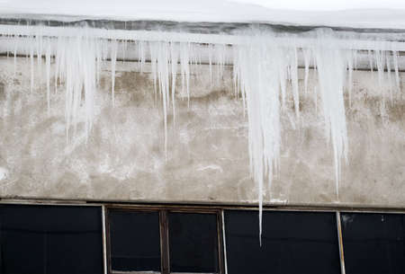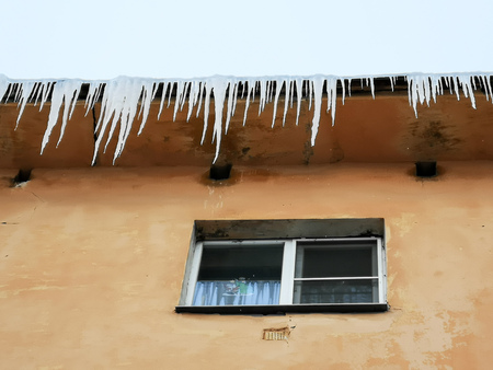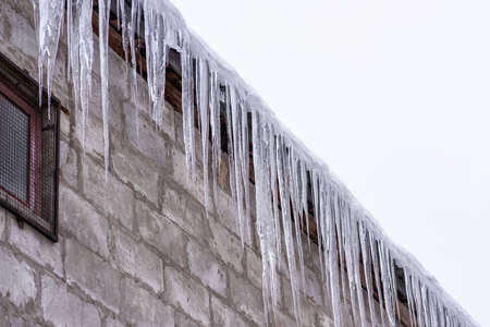 Long and massive icicles hanging from the roof of an old building. . High quality photo