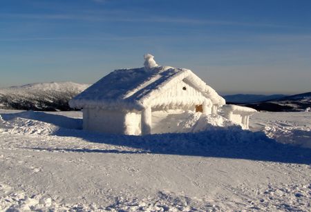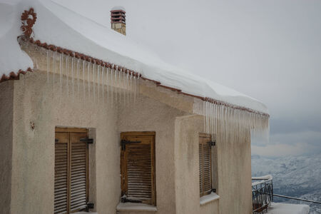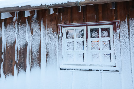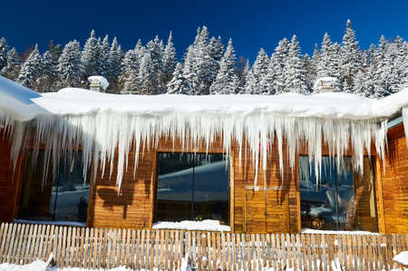 Icicles and snow on an old wooden cottage, Donovaly, Slovakia