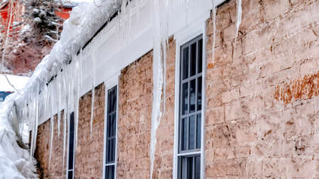 Panorama crop Sharp spiked icicles against windows and stone exterior wall of home in winter