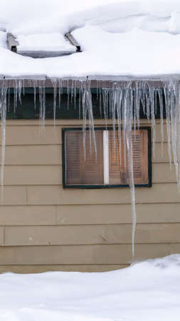 Vertical crop Snow covered roof with row of icicles over windows and wooden wall in Park City