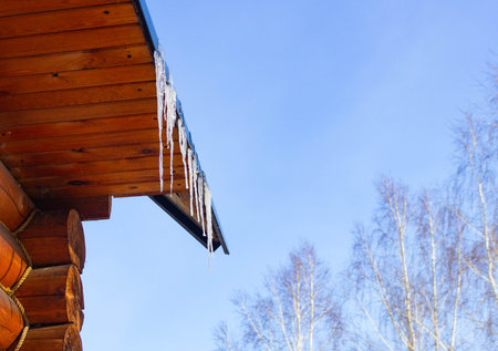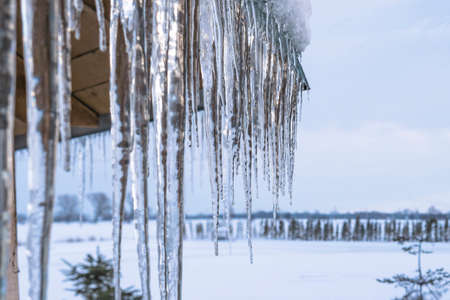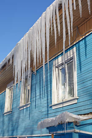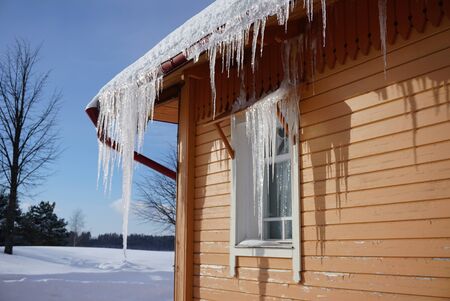 Long transparent icicles hang on roof of house in village in northern Europe at winter sunny day.