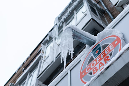 Huge icicle hanging on drain pipe of residential building on sign of coffee bar. Ukraine, Zhitomir, November 24, 2022
