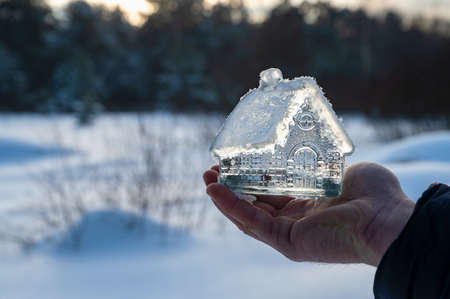 Close-up of man's hand holding small glass, crystal house against background of winter landscape. Concept of dream home, real estate business. Take out mortgage. copy space