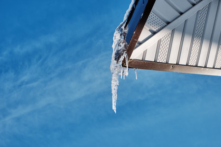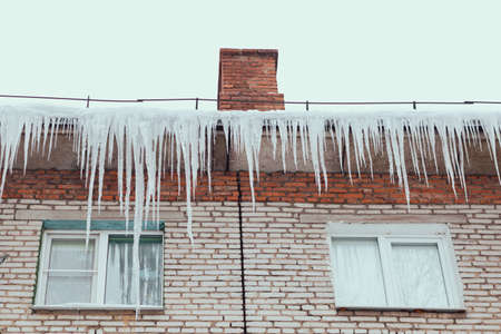 Beautiful huge icicles hang from the roof of the building. Melting icicles in the rays of the spring sun. Ice dam in gutter and ice frozen on roof in winter. Icicles falling danger concept.