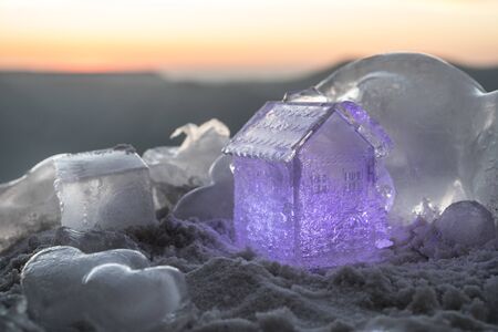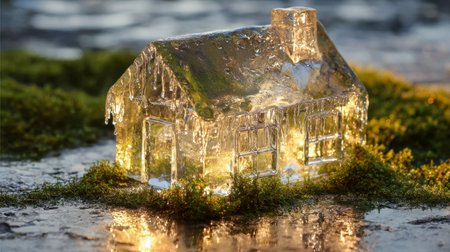 A delicate, crystalline home radiates a gentle amber hue as the setting sun casts its golden glow over a tranquil winter scene, nestled amid icy grass and calmness.