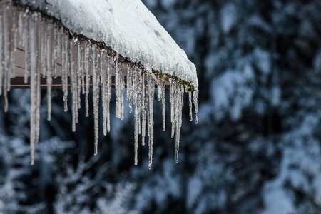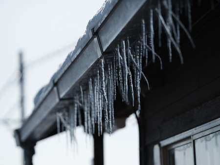 Large icicles on roof of house in winter. Close-up, selective focus.