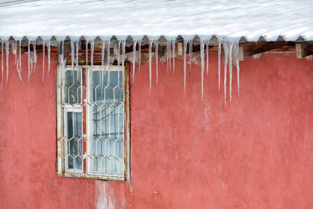 Ice icicles hang from the roof above the barred window of an old house with a red wall.