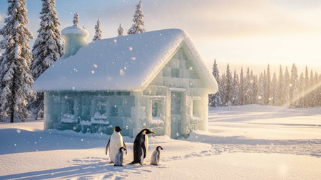 A charming snow-covered house surrounded by evergreen trees, with a family of penguins walking in the forest, creating a heartwarming winter scene.