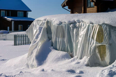 In winter, long icicles hang from the roof of an old barn. The fence and roof are covered with snow