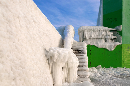Frozen winter seascape in port of Wladyslawowo. Baltic Sea coast in Poland.