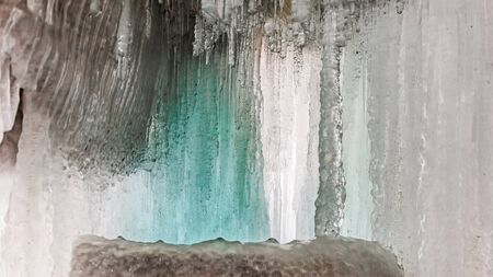 Blue ice stalactite on cliff, winter season in Siberia, Russia, nature background image
