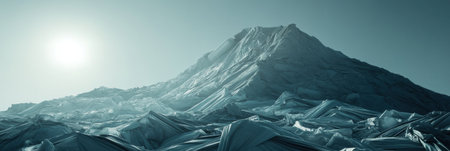 A towering mountain of plastic waste fills the landfill, silhouetted against a clear sky, highlighting the need for environmental action.