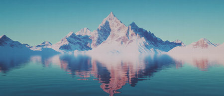 Snowy mountain peaks create serene reflections in crystal clear lake water at sunrise
