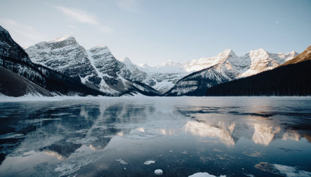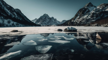 An AI generated illustration of A stunning tranquil scene featuring a lake filled with ice surrounded by towering snow-capped mountains
