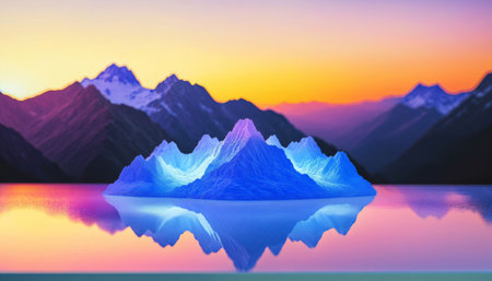 photo of landscape nature iceberg and mountain with orange sunset light, generative AI