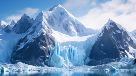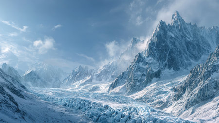Breathtaking landscape featuring a massive glacier flowing down from towering snow capped peaks, creating a stunning scene of icy wilderness under a vibrant blue sky with scattered clouds