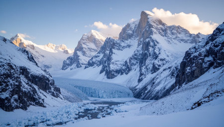 A stunning view of towering glacial peaks surrounded by a vast icy expanse. This serene and captivating landscape showcases the beauty of remote wilderness in winter.