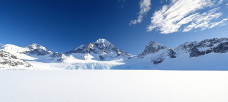 Snowy mountain peaks under clear blue skies, panoramic copy space