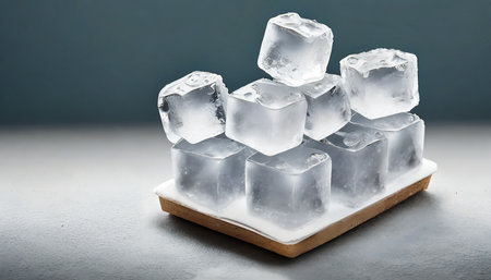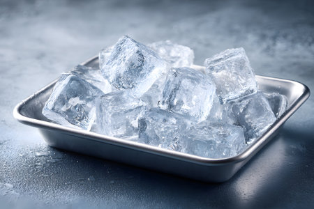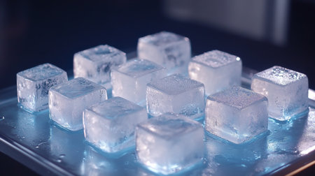 A stunning arrangement of clear ice cubes resting on a blue tray, reflecting light and creating a refreshing look ideal for summer drinks or cool ambiance.