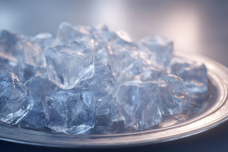 Cool ice cubes sit elegantly on a white plate, set against a soft blue background, perfect for summer drinks, refreshing beverages, and stylish presentations.