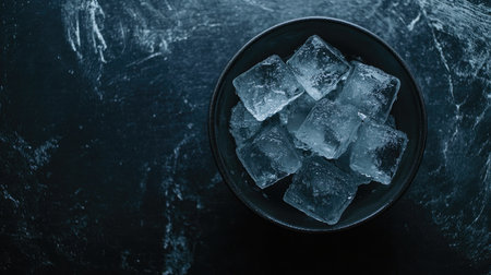 A top-down view of crystal clear ice cubes arranged in a black bowl, showcasing the refreshing and appealing texture. Perfect for beverage photography.
