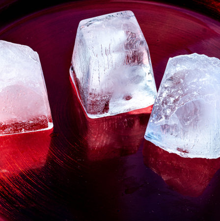 Close-up of melting ice cube with red liquid and water droplets. That the image is generated using AI.