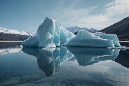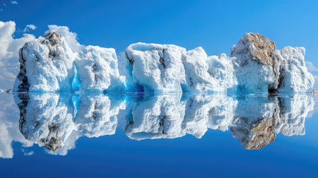 This stunning image captures majestic icebergs reflected perfectly in the calm Arctic waters, framed by a clear blue sky and soft clouds, showcasing nature's beauty.