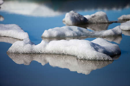 Chunks of ice on a winter frozen river reflected in melt water
