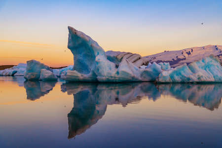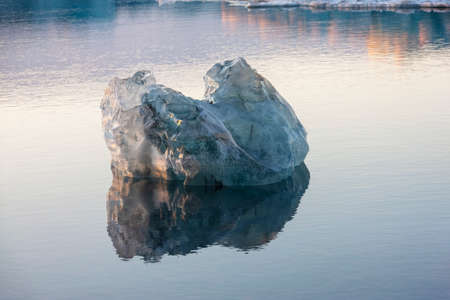 Gorgeous morning light in the Ice Lagoon. Drift ice Ice Lagoon - Jokulsarlon. Icebergs and ice floes are reflected in the smooth water surface. The concept of extreme northern tourism
