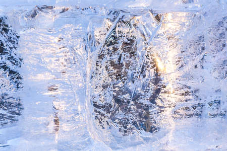Transparent shining clear ice icicles close-up sparkling on frozen wild lake shore in sunset light. Cold winter nature background