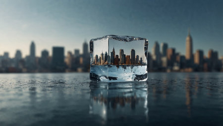 Cityscape in tiny ice cube. Symbolizing urban fragility and preservation. Ecology concept. Copy space.