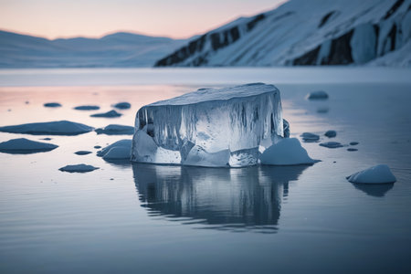 Dazzling icy crystals radiate a soft glow, creating abstract reflections on a tranquil blue surface during twilight hours.